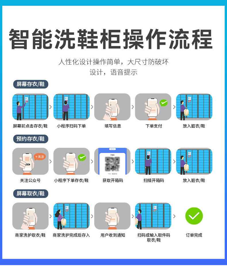智能洗鞋柜,用戶掃描洗鞋柜,進(jìn)入存鞋、取鞋、下單三個(gè)操作步驟,化繁為簡讓使用更簡潔。